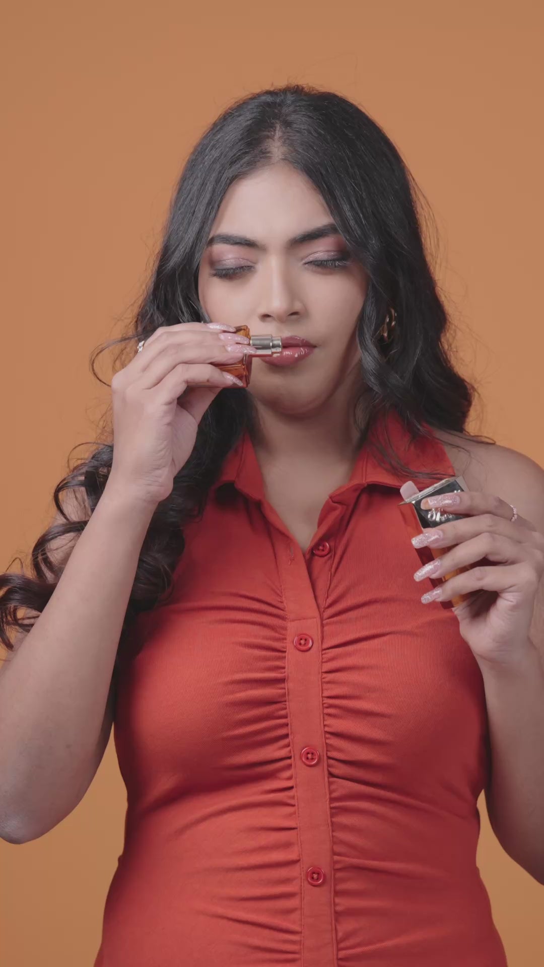 Take the heavier scent and spray it on your pulse point. Allow the scent 30 seconds to dry down. (Do not rub)